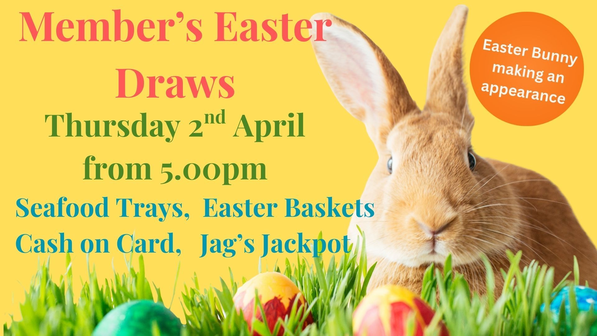 Join us for our Members’ Easter Draws from 5.00pm on Thursday 2 April, with fantastic prizes up for grabs including seafood trays, Easter baskets, cash on card and Jag’s Jackpot. Plus, the Easter Bunny will be making a special appearance for some extra festive fun.