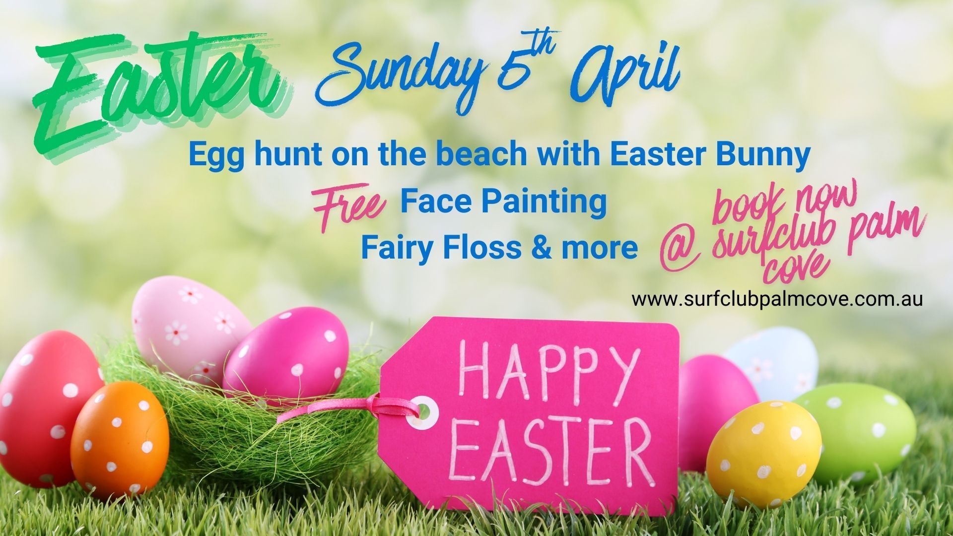 Celebrate Easter Sunday at Palm Cove Surf Club with a fun-filled day for the whole family. Enjoy an egg hunt on the beach with the Easter Bunny, free face painting, fairy floss and more — all set against our stunning beachfront location. Book now and make it an Easter to remember