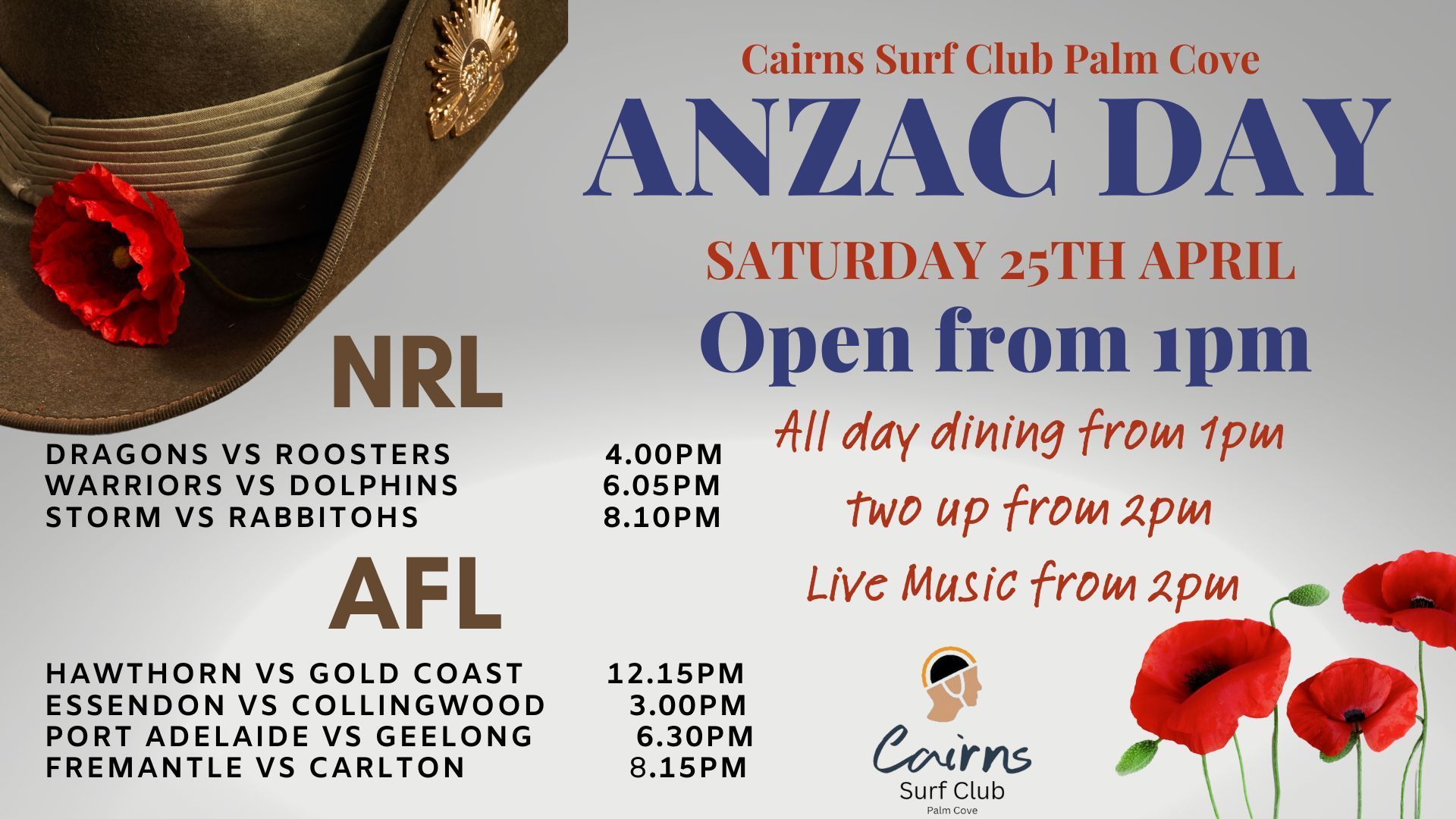 Commemorate ANZAC Day at Cairns Surf Club Palm Cove with a full day of sport, dining and live entertainment. We’re open from 1pm with all-day dining, Two-Up from 2pm, live music from 2pm, and live NRL and AFL on the big screens throughout the day. Join us as we remember and come together by the beach